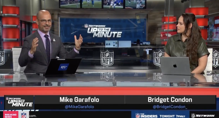 But when the news happened, NFL Network was in the middle of a replay of Good Morning Football from earlier in the day. Bridget Condon and Mike Garafolo broke in live from the NFL Network studios, spent three minutes breaking down the deal together. They also shared the news of wide receiver Rashid Shaheed being dealt from the New Orleans Saints to the Seattle Seahawks.